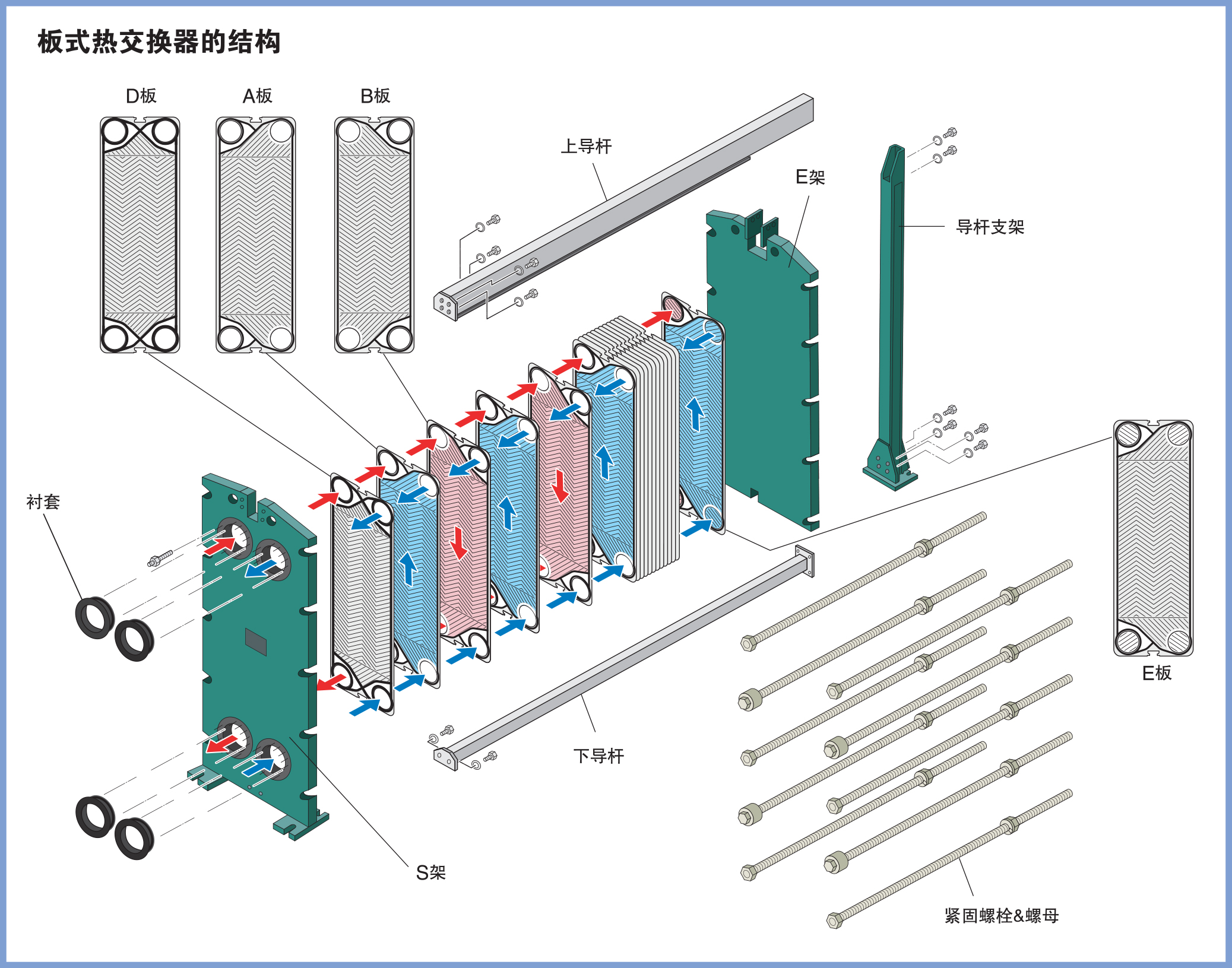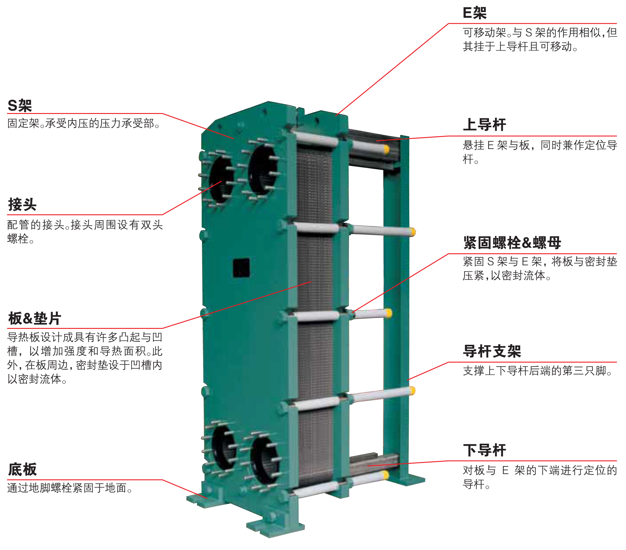 导热板是用抗腐蚀性的不锈钢或钛等冲压成形的。每块板上装有一个密封垫片。这些板从导杆上悬挂下来,并在一个固定架和一个可移动架之间,用螺铨连接在一起。板之间固定的间隙使液体充分的流动。进出口接头可安装在固定架或移动架上。