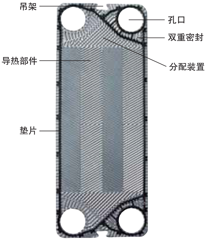 此外,波纹能提高湍流,来提高导热系数。导热板在每个角上有通道孔。每块板用一个装入其外缘糟中的垫片加以密封。